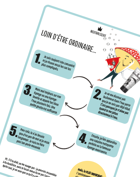 3. écologique = les tensioactifs sont facilement biodégradables. Nos recharges évitent les déchets. Le seau vide est réutilisé dans le ménage et se compose de matériaux recyclés.